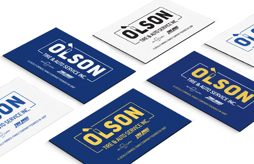 Olson Tire and Auto Service Inc. simply had a typeset logo previous to this logo. The challenge here was encompassing their full name, two sub logos that are needed for additional advertising dollars, and a tagline within one space.