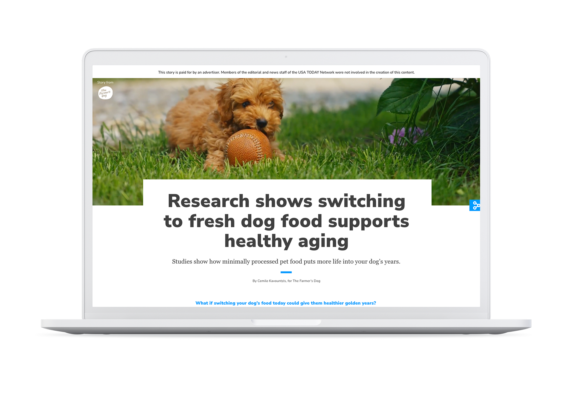 To gain awareness of a recent study that published backing that fresh dog food does extend a dogs life, The Farmers Dog came to us wanting to create an intuitive, native-branded Branded Content Page informing the public of the study results in an easy-to-digest form.